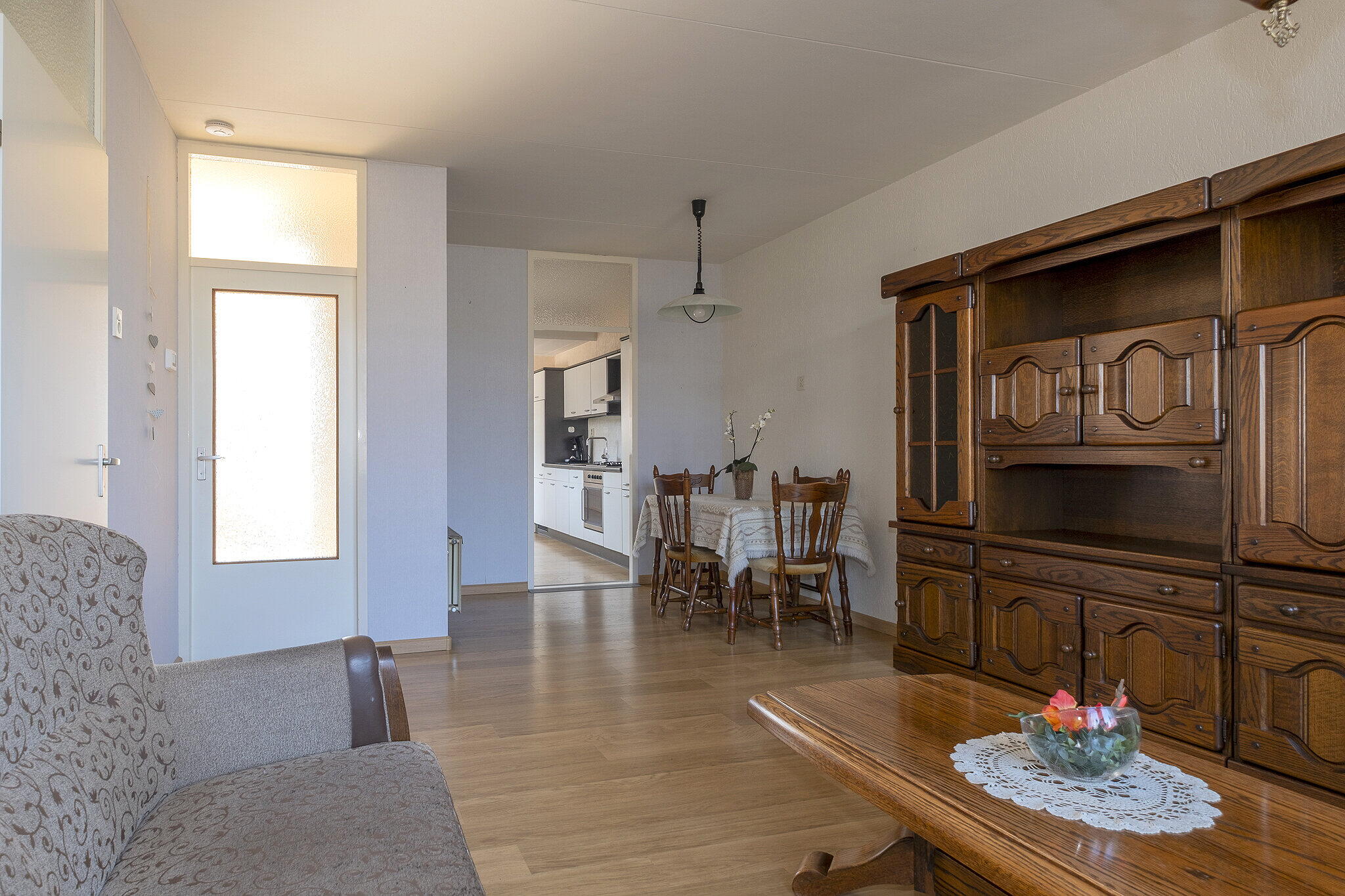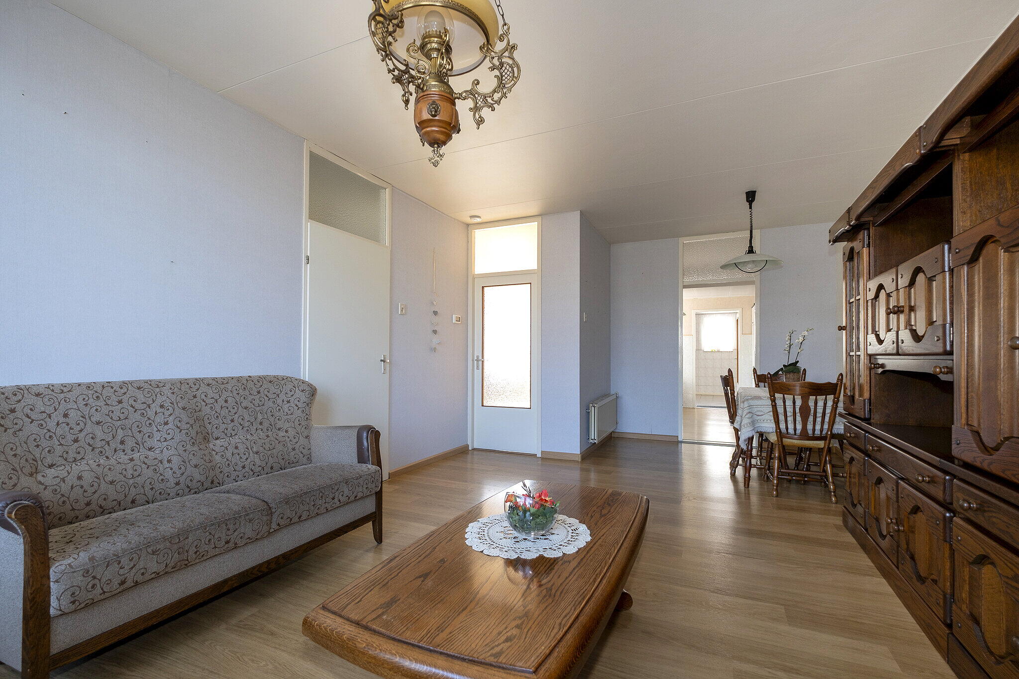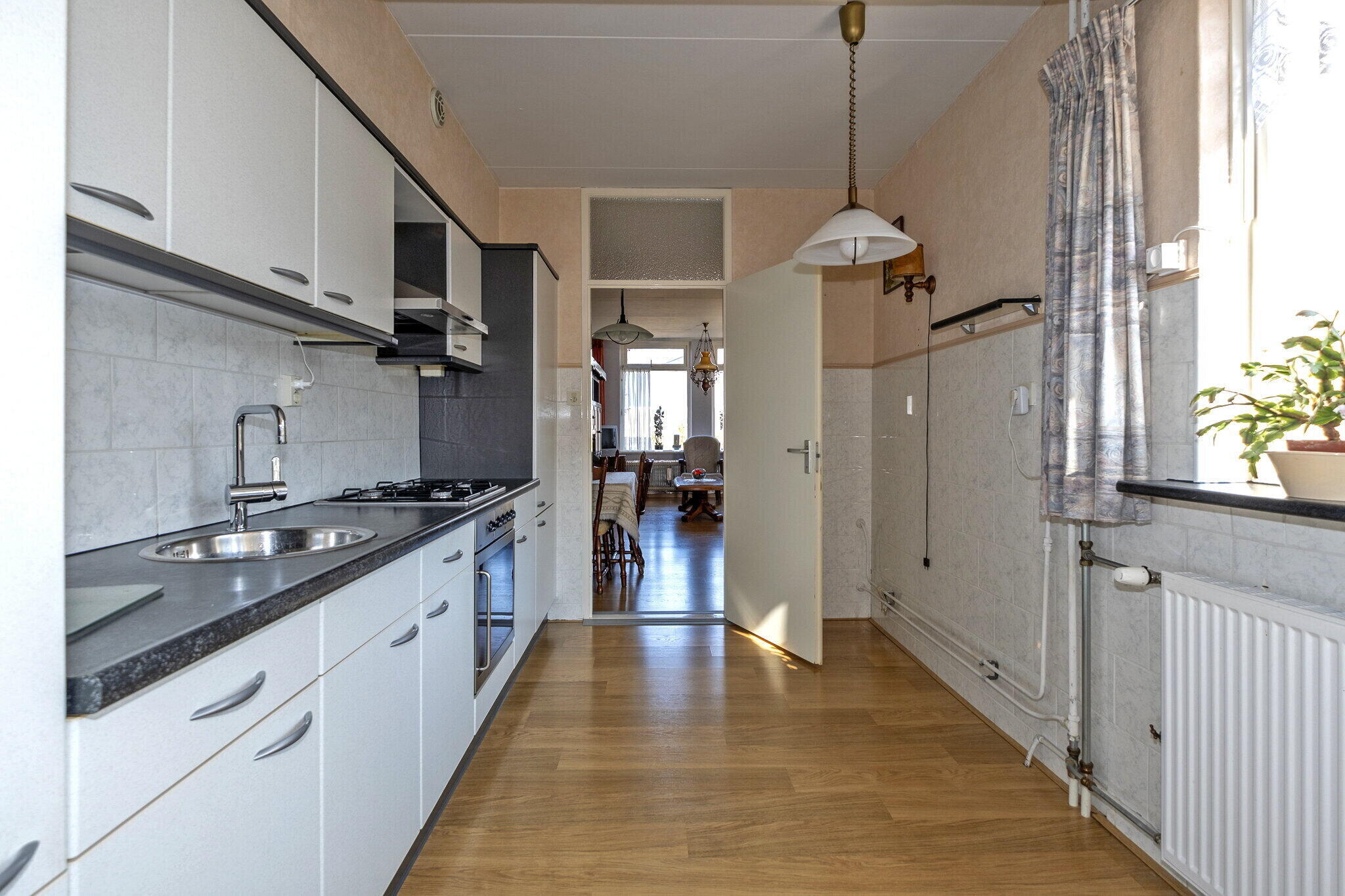 Via de entree kom je in de hal met toegang tot de verschillende vertrekken. Aan de voorzijde van de woning bevindt zich de woonkamer met een prettige lichtinval. Aan de achterzijde ligt de keuken, welke is voorzien van een koelkast, oven en gaskookplaat. Vanuit de keuken is er toegang tot de ruime bijkeuken waar zich de aansluitingen voor de wasmachine bevinden en de opstelplaats van de cv-ketel.