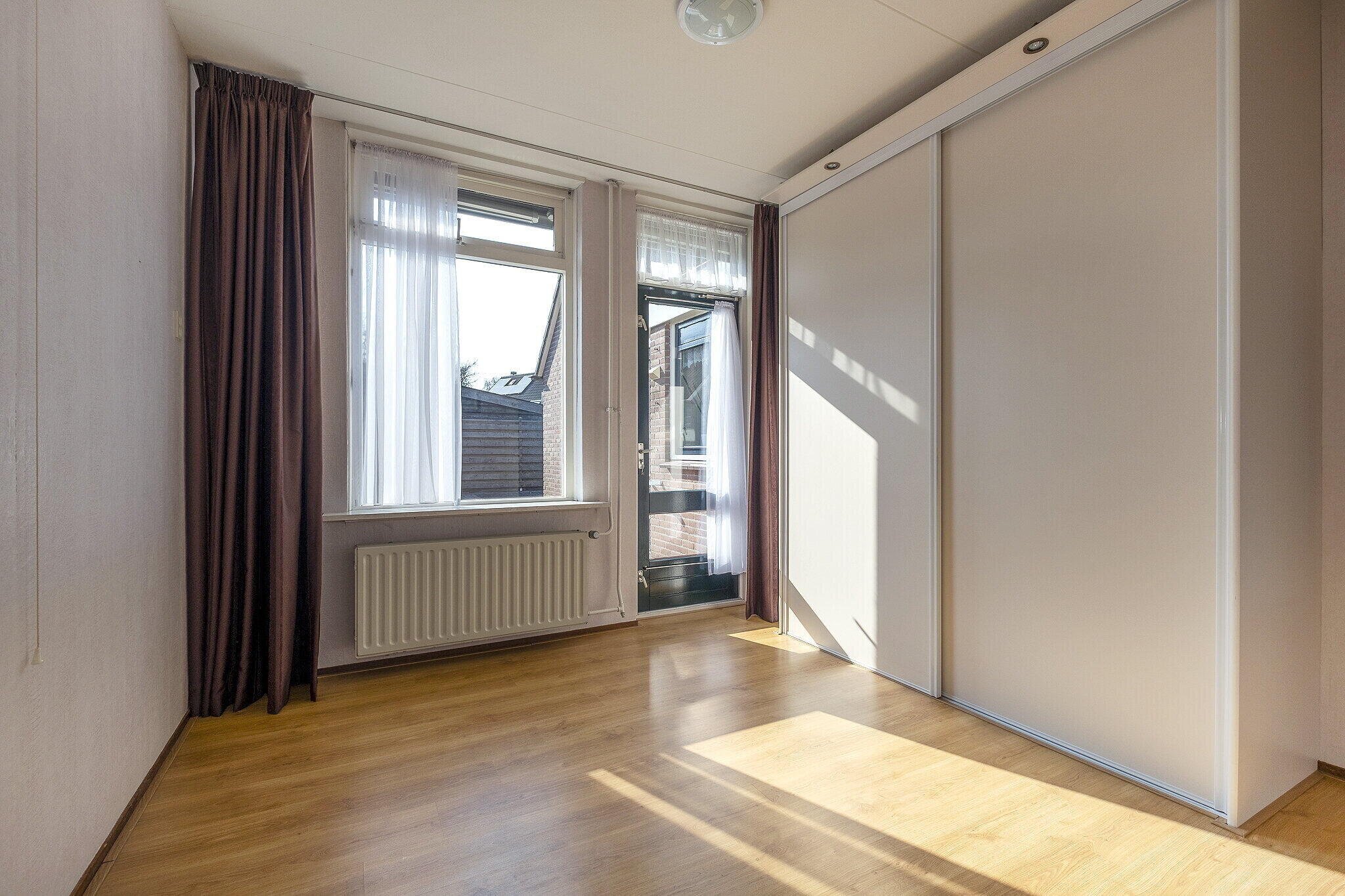 Op de begane grond bevindt zich tevens een slaapkamer met toegang tot de achtertuin. Vanuit deze slaapkamer is de badkamer bereikbaar. De badkamer is voorzien van een douche, wastafel en toilet.