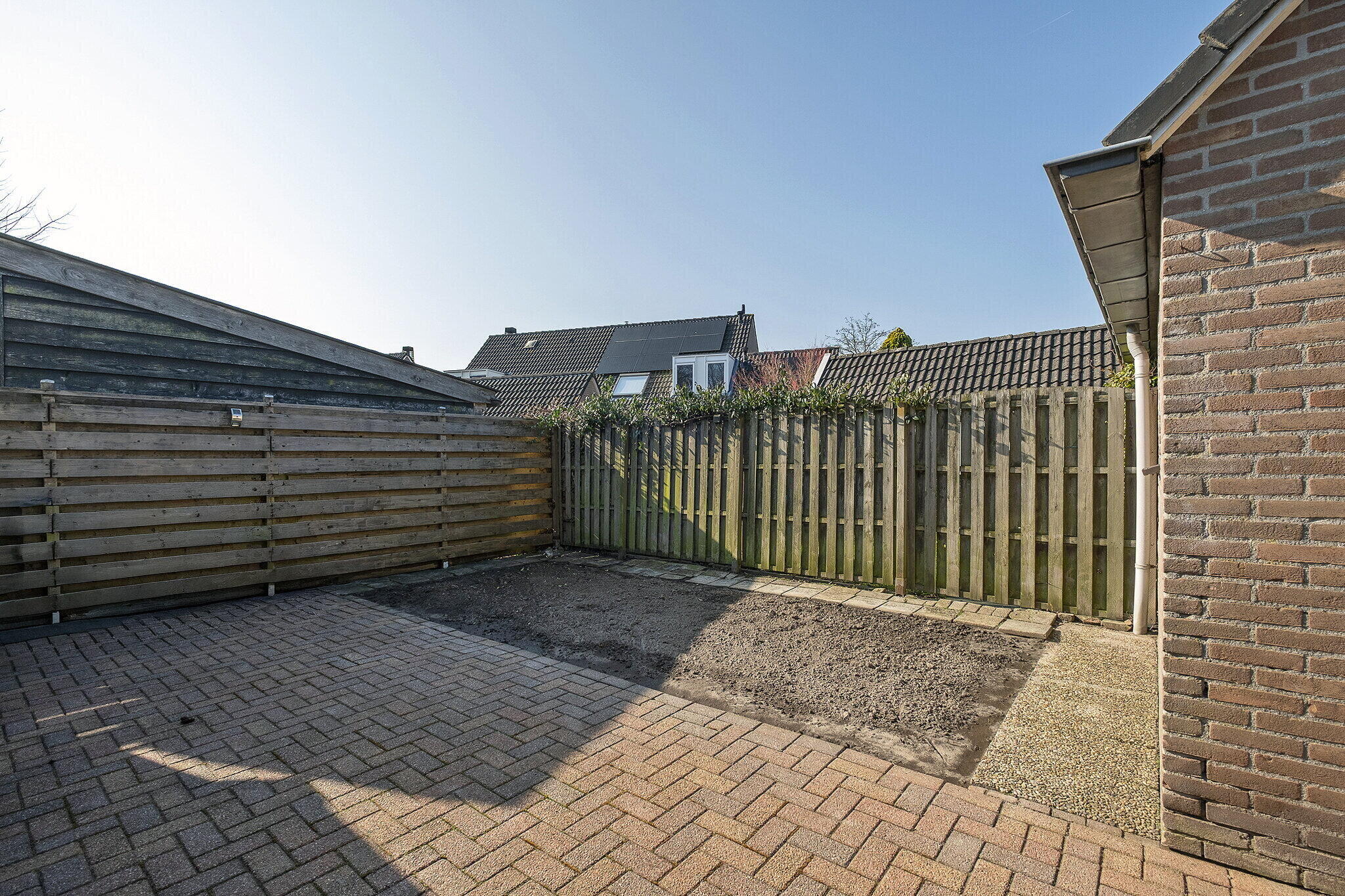 De achtertuin is gelegen op het zuiden, waardoor je hier volop kunt genieten van de zon. Het is een fijne plek om te ontspannen en te genieten van het buitenleven.